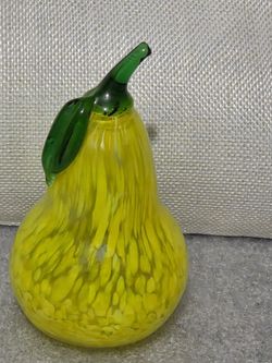 Vintage Hand Blown Art Glass Pear – Yellow Spatter Frit Design – Green Stem & Leaf Paperweight$25Milan, TN