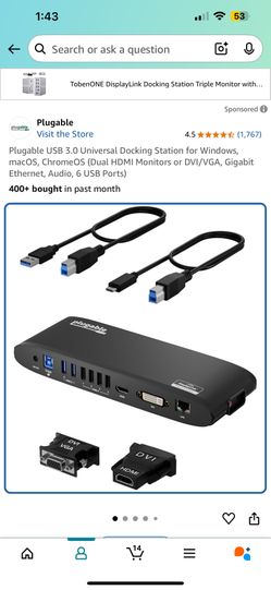 Plugable USB 3.0 Universal Docking Station for Windows, macOS, ChromeOS (Dual HDMI Monitors or DVI/VGA, Gigabit Ethernet, Audio, 6 USB Ports)$25San Diego, CA