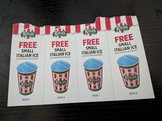 Rita's Italian Ice Coupons - 12 FREE Size Small - Coopersburg Location$10Northampton, PA