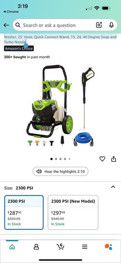 Greenworks 2300 PSI TruBrushless (2.3 GPM) Electric Pressure Washer, 25’ Hose, Quick Connect Wand, 15, 24, 40 Degree Soap and Turbo Nozzle$230Miami, FL