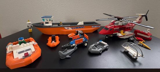 Lego fire helicopter and Lego Coast Guard Boat Orange Hull$25Los Rnchs Abq, NM
