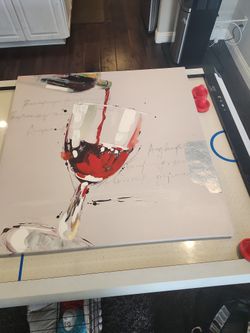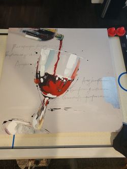 contemporary scene of red wine being poured into a glass, characterized by its loose, expressive brushstrokes and a neutral background featuring faint$100San Diego, CA