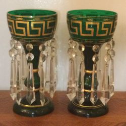 š„HUGE 19th Century PAIR of VICTORIAN Emerald Green GLASS MANTLE LUSTERSš„(13.5ā Tall) (Loaded With PRISMS) (GOLD Markings)š„$1500š„$1,500Costa Mesa, CA