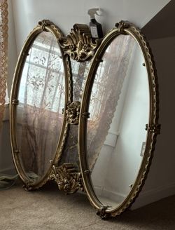 This is a vintage Hollywood Regency-style gold gilt double mirror, often attributed to Bassett Furniture.$950Holyoke, MA