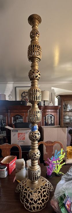 vintage, heavily ornate brass floor candelabra, often described as a Hollywood Regency or Chinese-style openwork pricket candlestick$100San Pedro, CA
