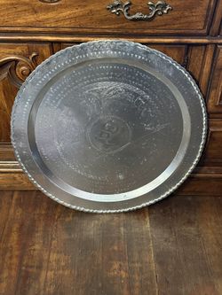 decorative silverplate serving tray featuring intricate etched designs and a scalloped edge. $50San Pedro, CA