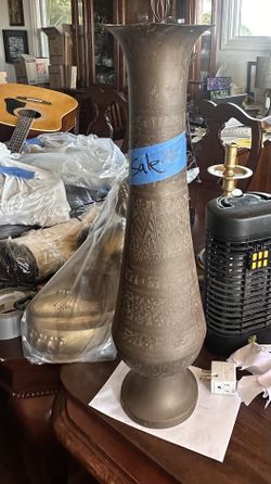 vintage engraved brass vase, likely handmade in India, features intricate floral or peacock patterns etched into its surface$50San Pedro, CA
