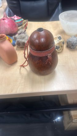 Traditional Vessel with Red Cord – Decorative Flask (7 × 4 in.) This elegant, rounded vessel features a polished reddish-brown surface and a striking$200Santa Ana, CA