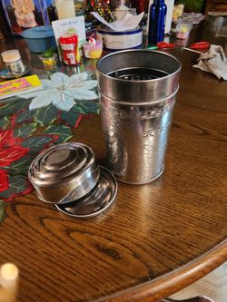 vintage metal tea caddy with an embossed Chinese or Asian-inspired design$15Montclair, CA