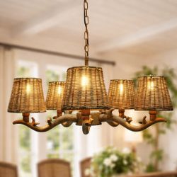23" Rattan Chandelier with Faux Wood Finish Boho Pendant 5-Light Brown Living Room Dining Room$100Hollywood, FL