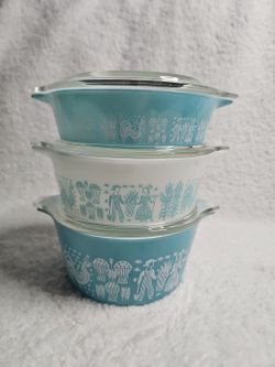 Vintage PYREX Turquoise Amish BUTTERPRINT Casserole Set 471, 472, 473 with Lids$150Meyersdale, PA