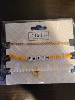 set of layering jewelry bracelets featuring a gold-toned chain, a yellow bead bracelet with "FAITH" letter beads, and a white bead bracelet with a but$7Hialeah, FL
