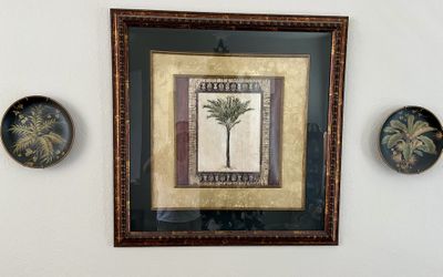 Wall Art Framed Prints Palm Tree Decor Set 2 w matching Ceramic Plates EUC$65West Palm Beach, FL