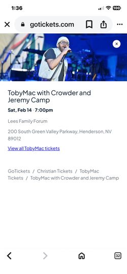 Two Tickets For Valentines Day Concert With Toby Mac, Crowder And Jeremy Camp$400Las Vegas, NV