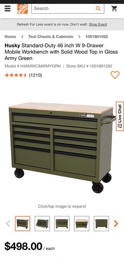 Husky Standard-Duty 46 in. W 9 Drawer Glossy Army Green Mobile Workbench Cabinet with Solid Wood Top. New! $400 Location: Arlington Se Habla Español$400Arlington, TX