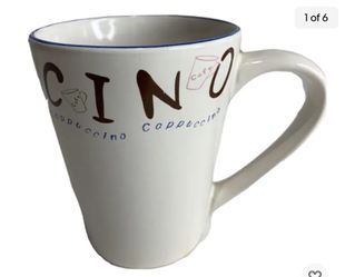 Tall 4.5 Inch Stoneware Coffee Mug White Cappuccino Cafe Graphics$10Naples, FL