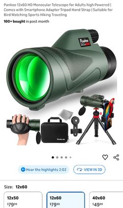 Pankoo 12x60 HD Monocular Telescope for Adults high Powered | Comes with Smartphone Adapter Tripod Hand Strap | Suitable for Bird Watching Sports Hiki$55Cathedral City, CA