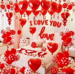 Red Valentine's Day decorations, red heart balloons and foil balloon, "I love you" banner, fake rose petals, hanging balloon pendant$15Phoenix, AZ