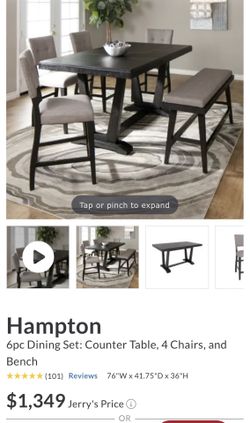 Hampton 6pc Dining Set: Counter Table, 4 Chairs, and Bench$1,050Compton, CA