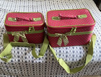 set of pink, polka dot cosmetic travel cases with green trim and straps.$45Raleigh, NC