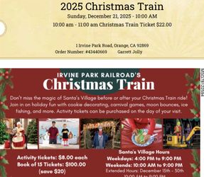 Irvine Railroad Train 8 Tickets 12/20 & 12/21$216Orange, CA