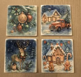 Set of 4 Christmas Coasters – Vintage Holiday Ceramic Drink Coasters with Reindeer, Gingerbread House, Red Truck & Ornaments – Perfect Xmas Gift$12Alpharetta, GA
