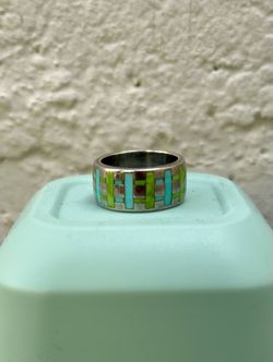 Vintage Sundance: Sterling Silver Turquoise & Gaspeite Inlaid Plaid Southwestern Ring - Size 6$100Pasadena, CA