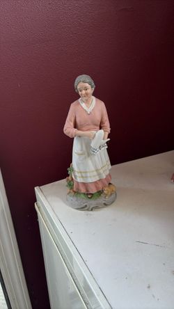 vintage Homco Home Interiors #1425 porcelain figurine of an elderly woman holding a coffee pot with a small dog at her feet. $20Anaheim, CA
