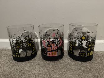 Halloween Glass Mugs Pink And Black Halloween Scene Xlarge Hand painted Set 3$50Lithonia, GA