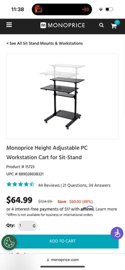 Monoprice Height Adjustable PC Workstation Cart for Sit-Stand$40Gardena, CA