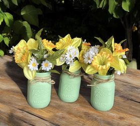 Chalk painted sage mason jars gift wedding - yellow DAFFODILS white DAISIES$30Rockaway, NJ