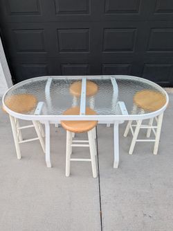 Glass patio table with swive topl bar stools Minor cleaning needed on chairs white surface$100Port St. Lucie, FL