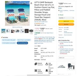 LET'S CAMP Backpack Beach Chair Set of 2, 4-Position Classic Lay Flat$79Kissimmee, FL