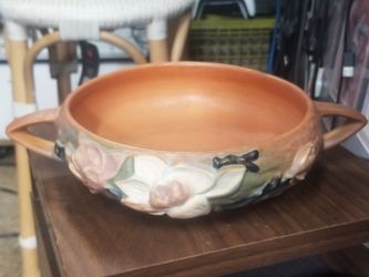 The Vintage Roseville Pottery Magnolia Console Bowl with Double Handles is a stunning piece of Art Deco style pottery from 1943. Originating from Amer$25Huntington Park, CA