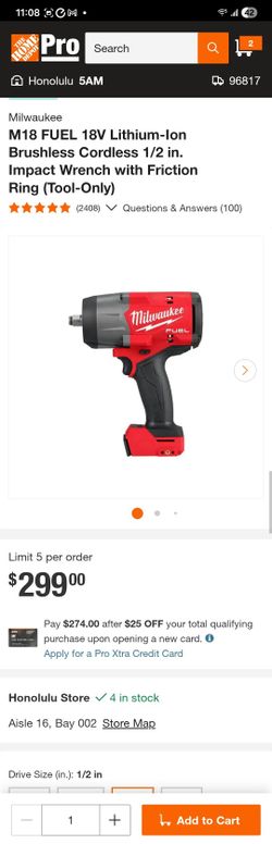 Milwaukee M18 FUEL High Torque Brushless Cordless 1/2 in. Impact Wrench$250Honolulu, HI