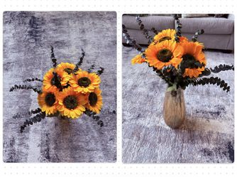 Sunflower with eucalyptus leaves in a glass vase - Rhettman, color light brown . $35Herndon, VA