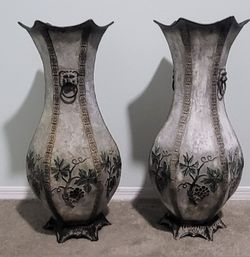 2 LARGE 24" METAL TIN VASE 6 PANEL W/EMBOSED GRAPE VINES LION RING HANDLES$40Ocoee, FL