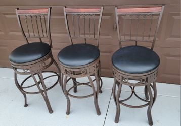 I have 3 solid bar stools for sale; they were used outdoors. They swivel 360 degrees. Heavy iron with a wooden backrest edge.$100Cape Coral, FL
