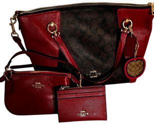 Authentic Coach 3-piece set featuring a red leather and signature canvas tote with matching wristlet and card holder. Stylish, versatile, and perfect$165North Riverside, IL