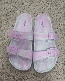 Cat & Jack Kids' Noa Footbed Sandals with a purple and blue tie-dye pattern. $5Simi Valley, CA