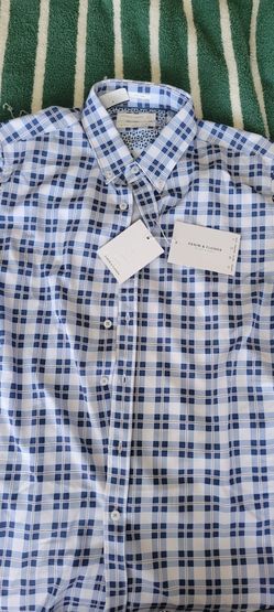 Denim & Flower Men's white/navy blue plaid short sleeve tech stretch shirt size L