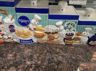 Phillsbury Doughboy Ceramic Kitchen Canister Set Flour, Sugar, Coffee , And Tea$100Alta Loma, CA