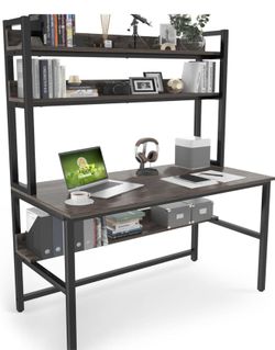 Desk with Hutch Bookshelves, Computer Desk with 3 Tiers Storage Shelves, Space Saving Design Black Metal Legs Desk with Grey Board, Easy Assemb$150Miami, FL
