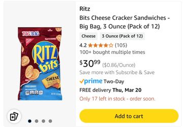 Ritz Bits Cheese Crackers 12 Per Case - 3oz Bags $6Chicago Ridge, IL
