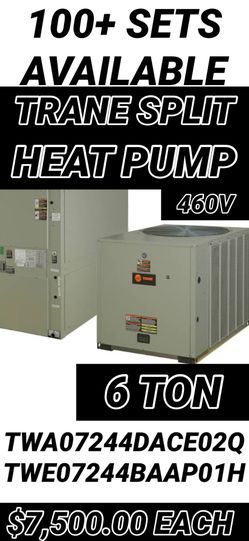 100+ SETS AVAILABLE TRANE SPLIT HEAT PUMP 460V 6 TON TWA07244DACE02Q TWE07244BAAP01H $7,500.00 EACH$7,500Los Angeles, CA