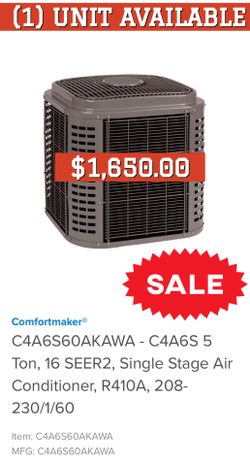 (1) UNIT AVAILABLE $1,650.00 SALE Comfortmaker® C4A6S60AKAWA - C4A6S 5 Ton, 16 SEER2, Single Stage Air Conditioner, R410A, 208- 230/1/60 Item: C4A6S60$1,650Los Angeles, CA