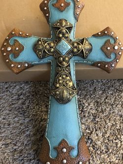 Wood box with a turquoise Cross on top$5San Diego, CA