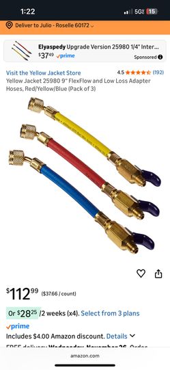 Yellow Jacket 25980 1/4" FlexFlow Ball Valve Hose Adapters - 3 Pack RYB$80Roselle, IL