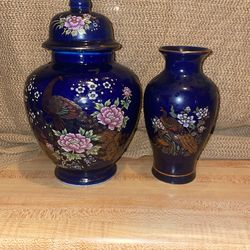 Vintage Japanese Cobalt Blue Peacock Porcelain Lidded Ginger Jar & Small Vase$27Mobile, AL