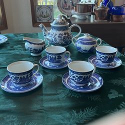 Blue Willow large teapot, creamer , lidded sugar, four cups and saucers$80Graham, WA